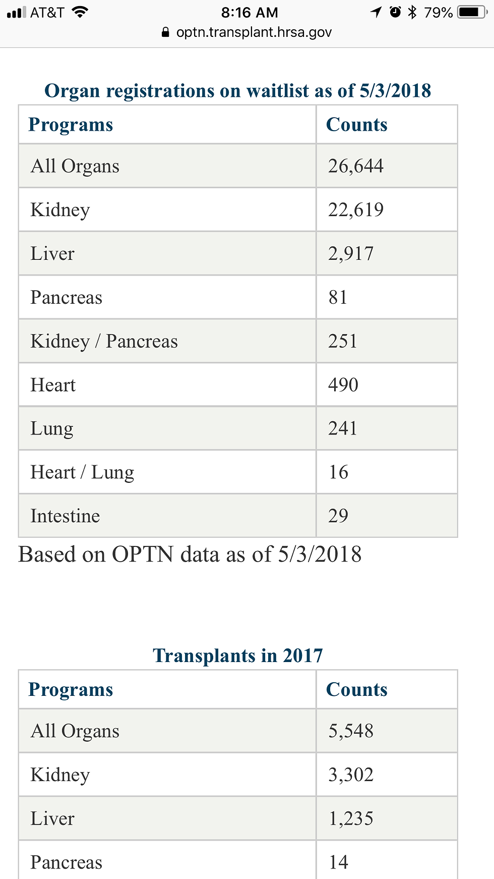 A screenshot of number of individuals on the heart/lung transplant wait list